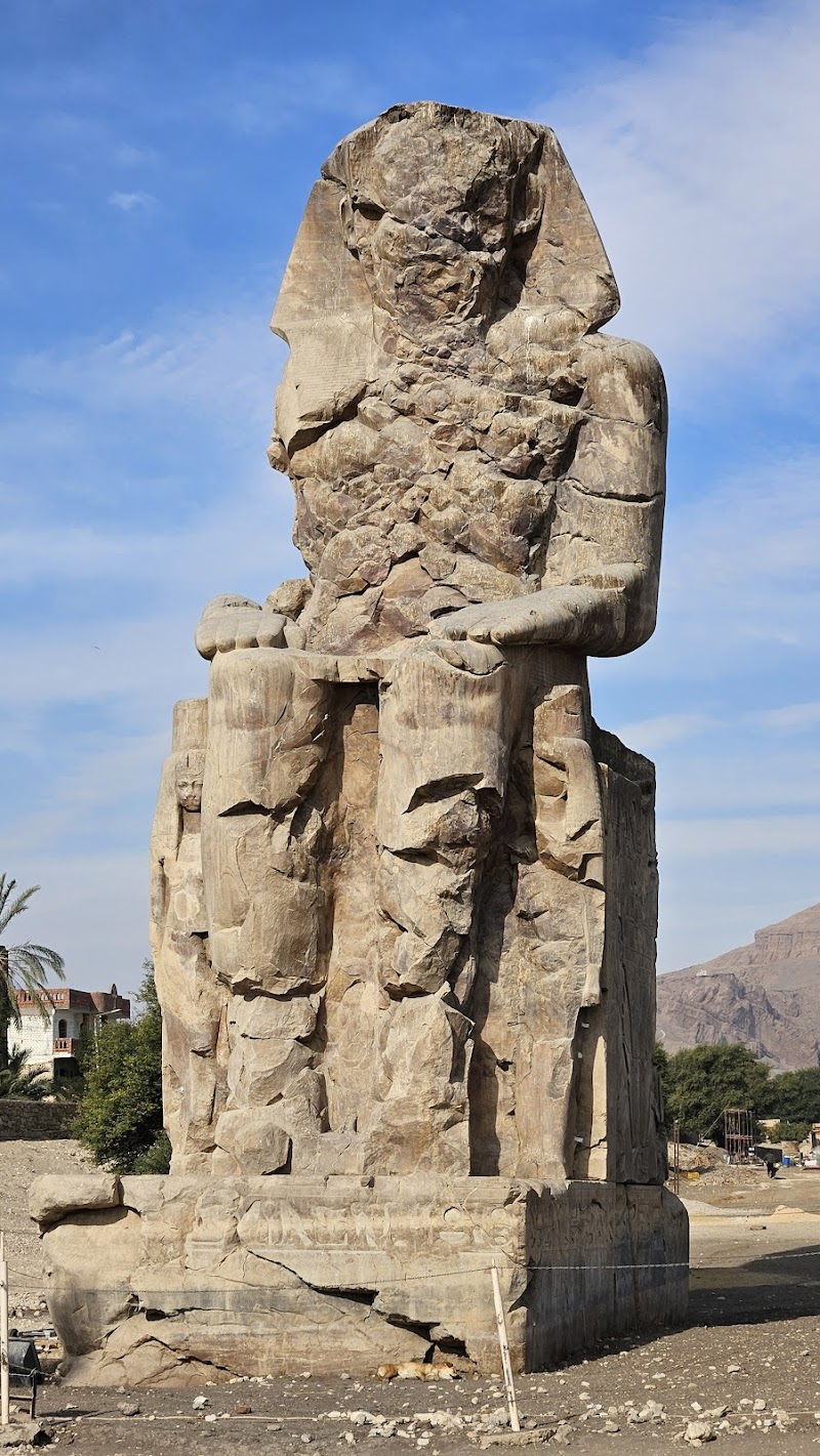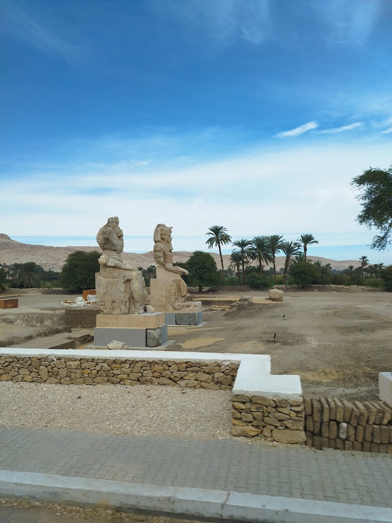 Pair of huge Egyptian statue figures, the only remains of the ancient temple of King Amenhotep III.