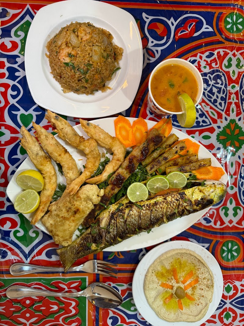 مطعم متواضع يتبع الخدمة الذاتية ويقدّم أسماكًا كاملة مشوية وأطباق مأكولات بحرية على الطراز العائلي